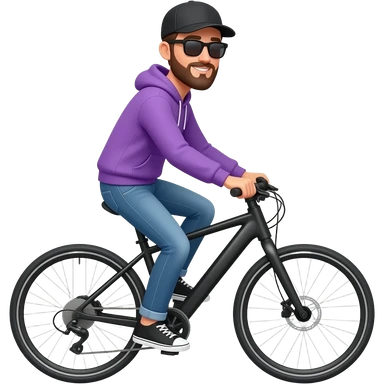 tall skinny guy with black basecap, fine-beard, purple hoodie, sunglasses and jeans rides a black e-bike with nature in the background. emoji