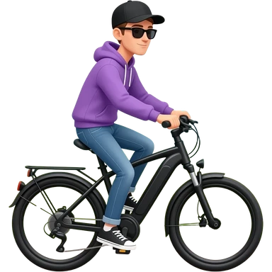 tall skinny guy with black basecap, purple hoodie, sunglasses and jeans rides a black e-bike with nature in the background. emoji