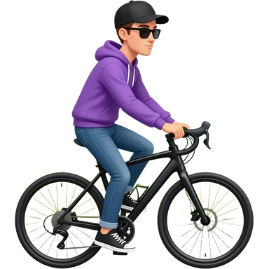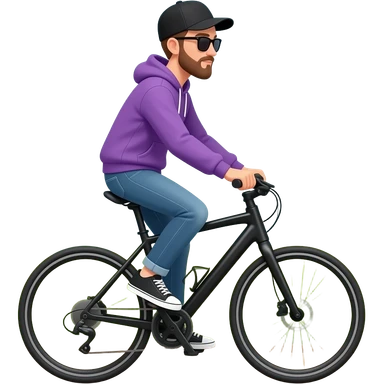 tall skinny guy with black basecap and purple hoodie and jeans rides a black bycicle in white background. emoji