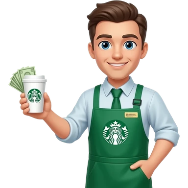 Woman drinking Starbucks coffee in computer, balayage hair, mid length. Brown eyes , round face, emoji