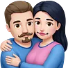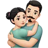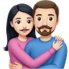 Tall strong white man with brown mustache goatee wearing blue hugging a chubby short pale woman with long black hair wearing pinkemoji