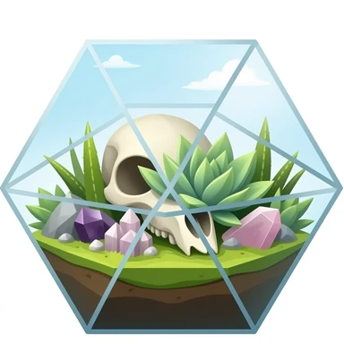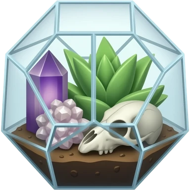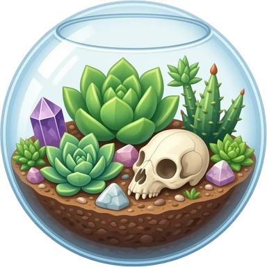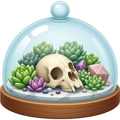 Tall succulent dome-shaped terrarium with amethyst and rose quartz and marble cluster and animal skull inside emoji | AI Emoji Generator