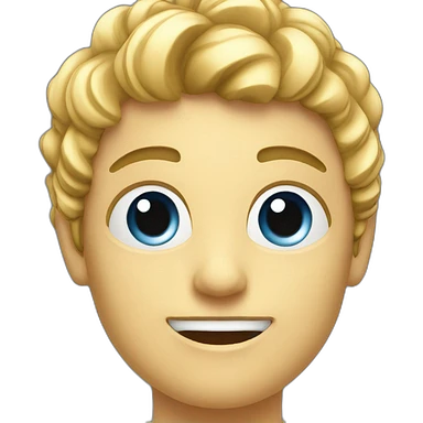 io biondo con ciuffo a frangia riccia, rasatura laterale, occhi cerulei, carnagione chiara, labbra carnose e poche lentiggini, con un orecchino emoji