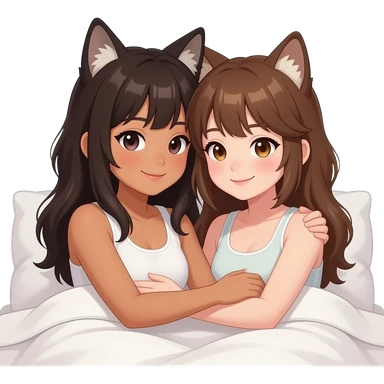 Two girls one with tan skin black hair one with white skin black hair cuddling in a bed together emoji