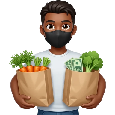 Tan black young man holding grocery bags full of carrots and money wearing a black face mask emoji