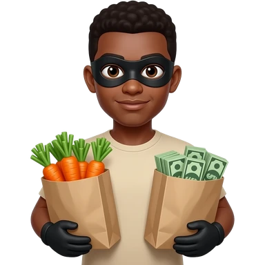 Tan black young man holding grocery bags full of carrots and money wearing a black ski mask emoji | AI Emoji Generator