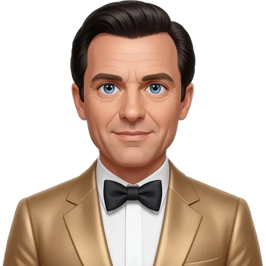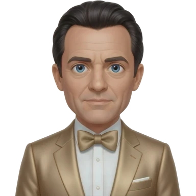 Oliver Reed with blue eyes, black hair, tan metallic suit with bow tie emoji