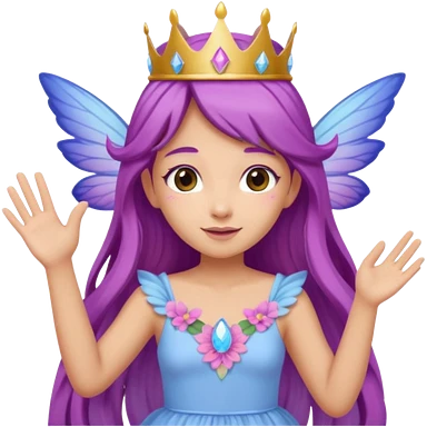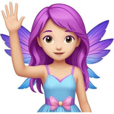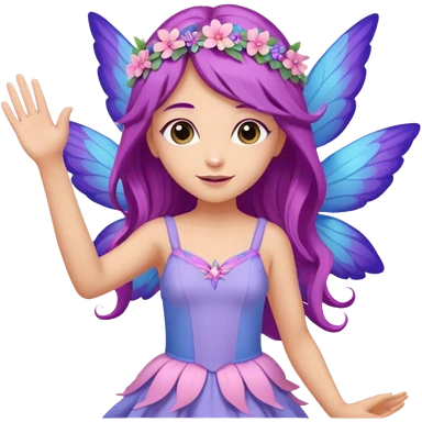 Tan female fairy, long purple hair, flowers on head, large pastel pink blue and purple wings, wearing a, pastel pink dress, Waving with one hand emoji | AI Emoji Generator