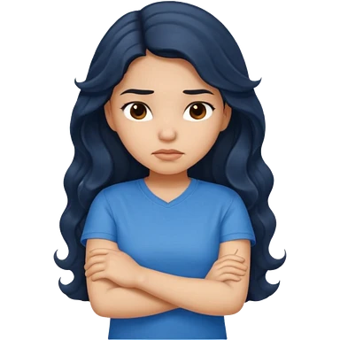 girl dark long wavy hair crossing her arms with slight pout emoji