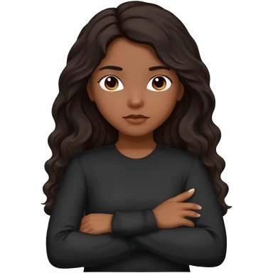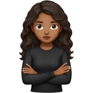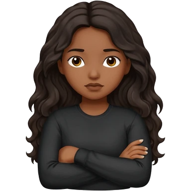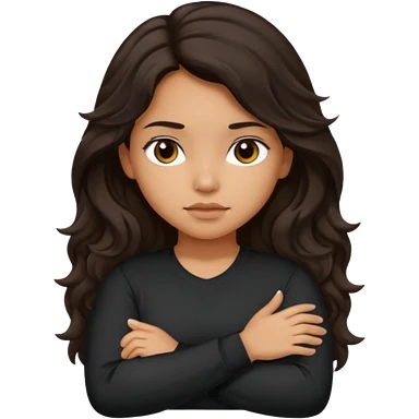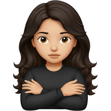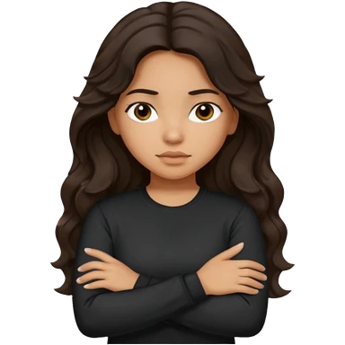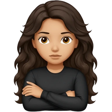 Hispanic girl with dark long wavy hair crossing her arms with slight pout wearing a black long sleeve shirt emoji