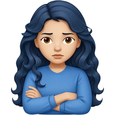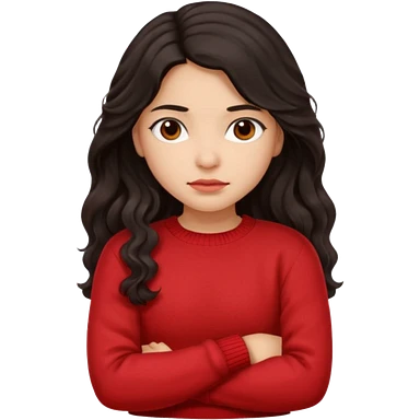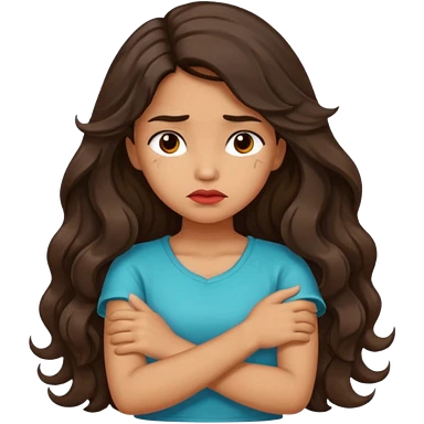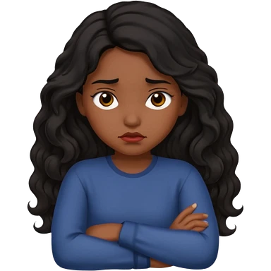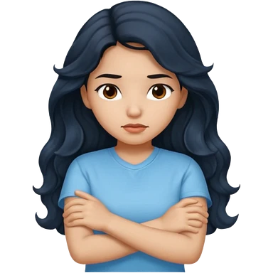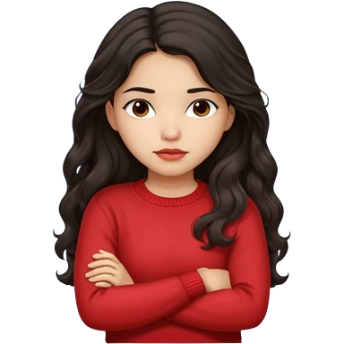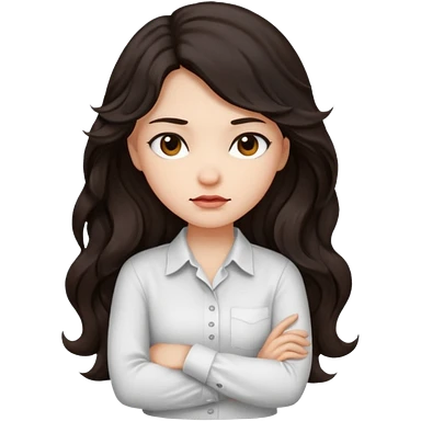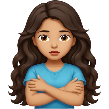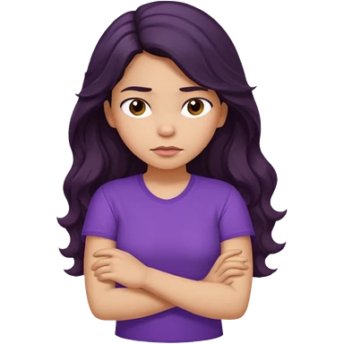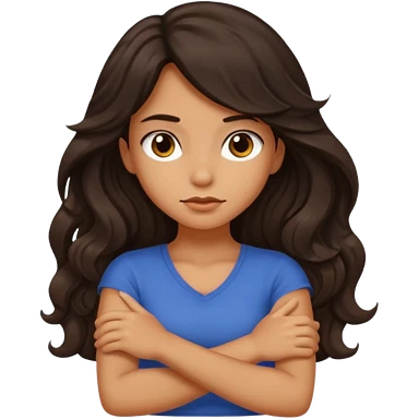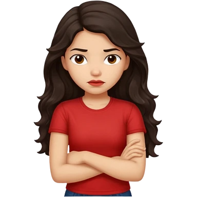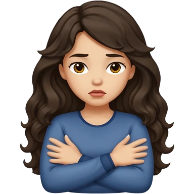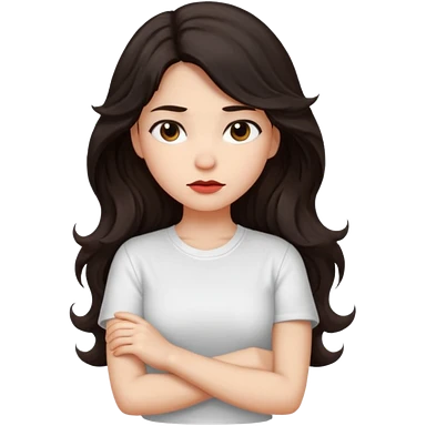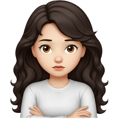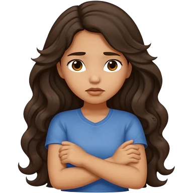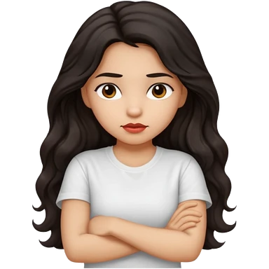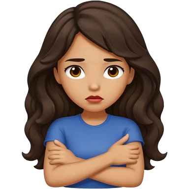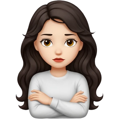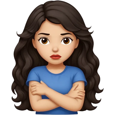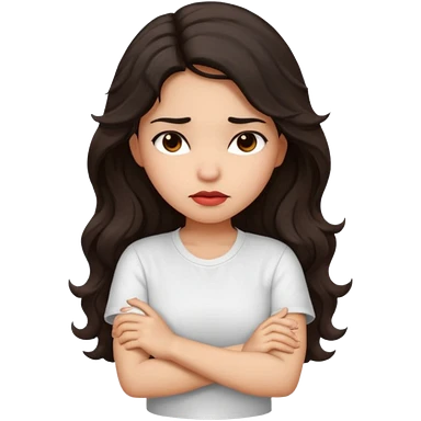 girl dark long wavy hair crossing her arms with slight pout emoji