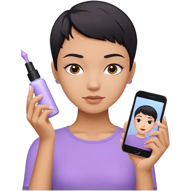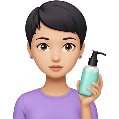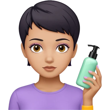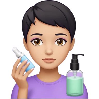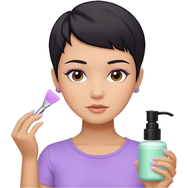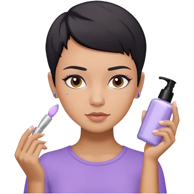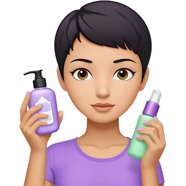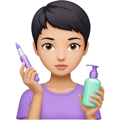 tan girl with pastel purple shirt with black hair & a pixie, doing her skin care emoji