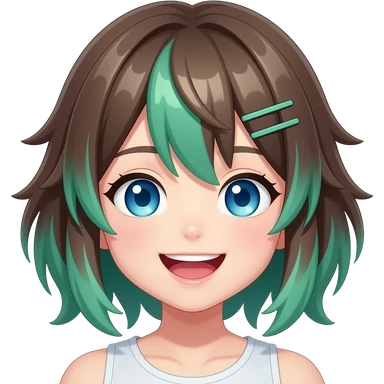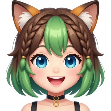 Brown and green hair with blue eyes vtuber laughing with fox ears emoji