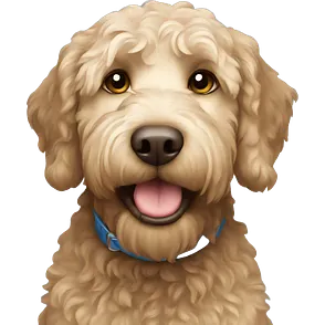 Chocolate and tan labradoodle with yellow-green eyes and hair in a bun on the top of head emoji