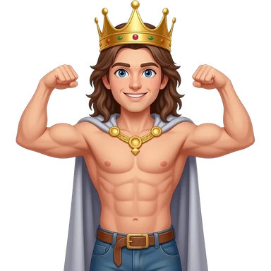 muscular shirtless twink with very long brown hair wearing crown and flexing emoji