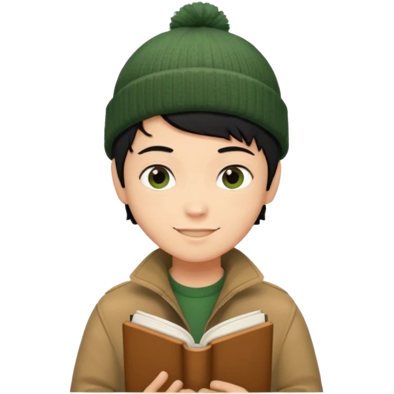 tan skin, non binary man with pixie cut black hair, wearing brown jacket and dark green beanie, shy smile , holding up book emoji | AI Emoji Generator