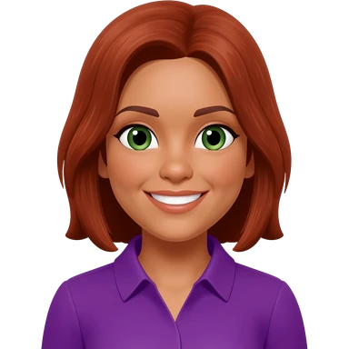 Tan Woman with medium red brown hair and green eyes and purple shirt smiling emoji