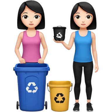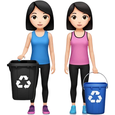 generate a genmoji of a black haired girl in a pink tank top and black leggings holding a black trash bag. Standing with her is a brunette girl in a similar blue tank top and black leggings. Standing in front of a dustbin emoji