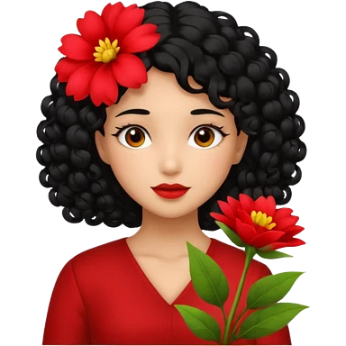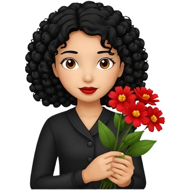 A girl with curly black hair and res flowers in her hands emoji