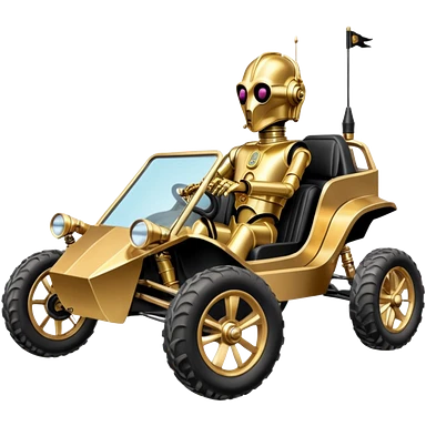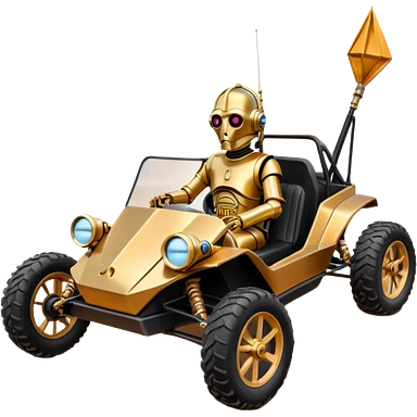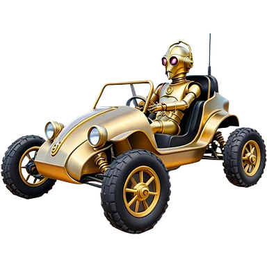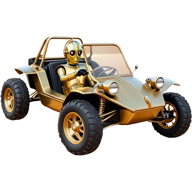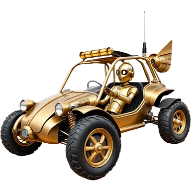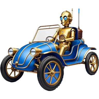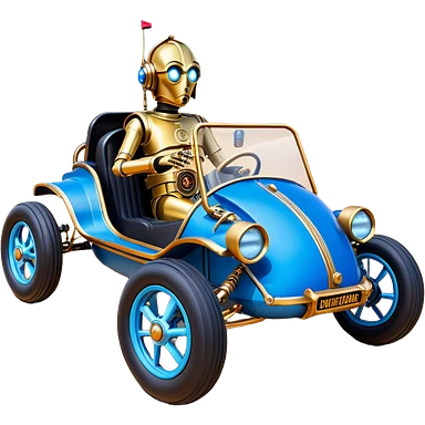 tarnished blue neon underglow C-3PO ghost buster 1964 delicately ornate rosegold wood accents Model-T off road buggy buckboard powered by electric motors and batteries with racing safety belts while flying rapidly roughening terrain stable on strong agile advanced suspension and steeringemoji