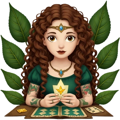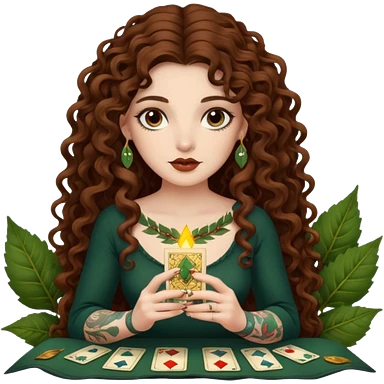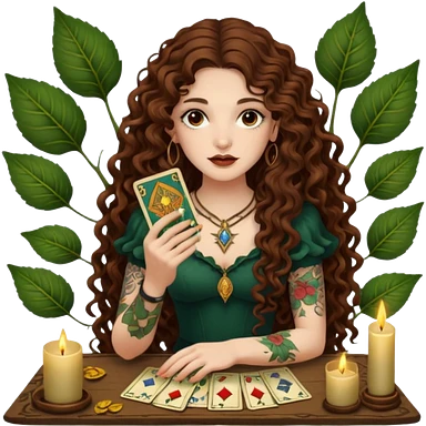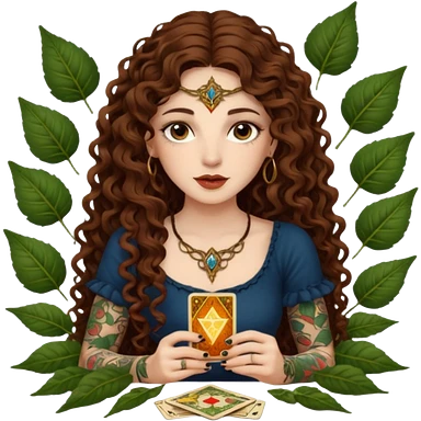 woman with long curly brown hair, brown eyes, white skin, tattoos, reading tarot cards made of leaves emoji