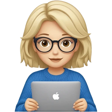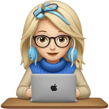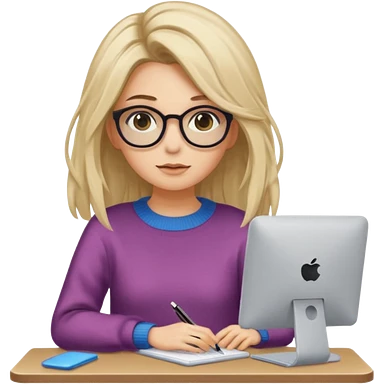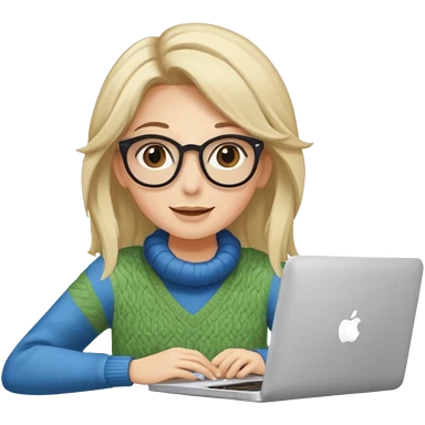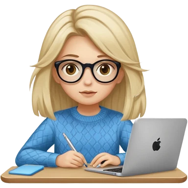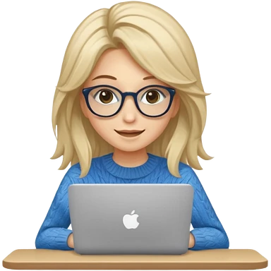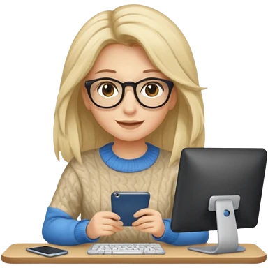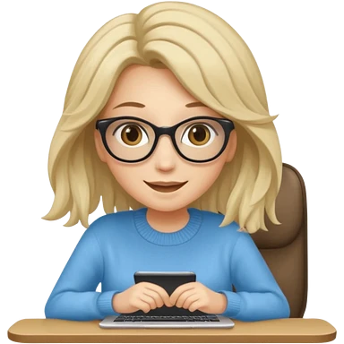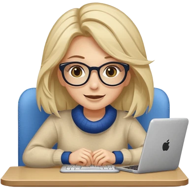 ragazza bionda con capelli molto lunghi, con occhiali tartarugati, occhi azzurri, con maglione beige, seduti alla scrivania che lavora al pc emoji
