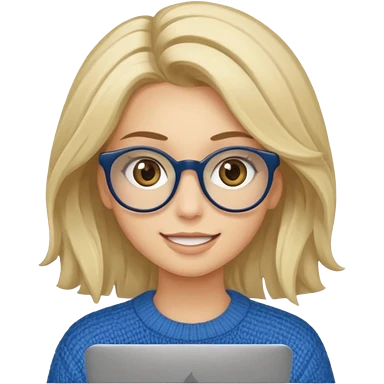 ragazza bionda sorridente con capelli molto lunghi, con occhiali tartarugati, occhi azzurri, con maglione beige, seduti alla scrivania che lavora al pc emoji