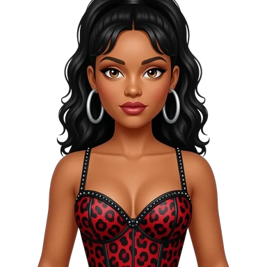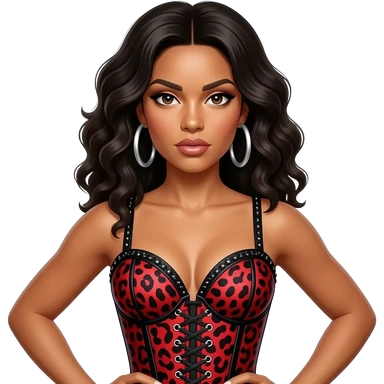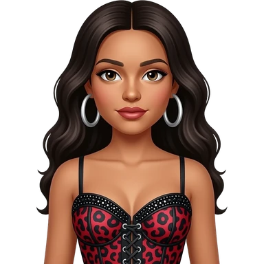 Tate McRae wears a bold red and black leopard-print corset top with sparkling black embellishments. She pairs the look with large silver hoop earrings for a fierce, high-energy stage presence. emoji
