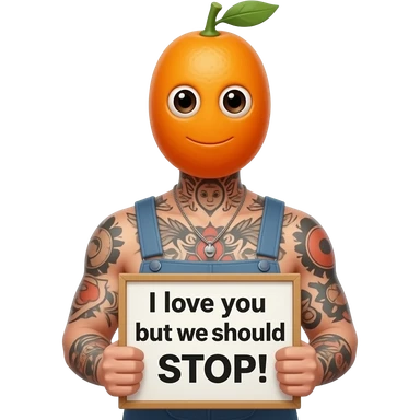 Tattooed Kumquat holding sign saying “I love you, but we should STOP !” emoji