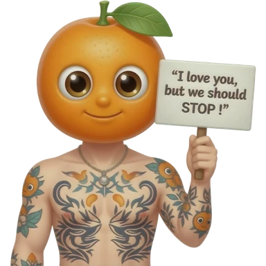 tattooed Kumquat holding sign saying “I love you, but we should STOP !” emoji