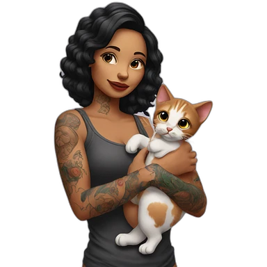young tattooed woman with brunette long hair holding a red and white cat in her hands emoji