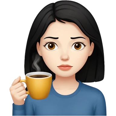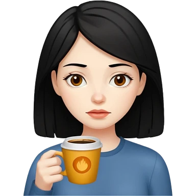 컴퓨터로 작업하면서 커피를 많이 마시고 있는 피곤해보이는 검은머리 여자 emoji