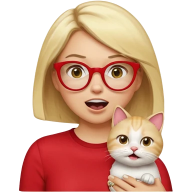 emoji style, waist-up woman with light skin, blonde bob hair, white cat-eye glasses, red shirt, hand cupped tightly around her mouth, hand very close to face as she shouts forward, excited expression, simple background emoji