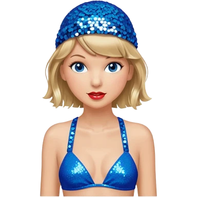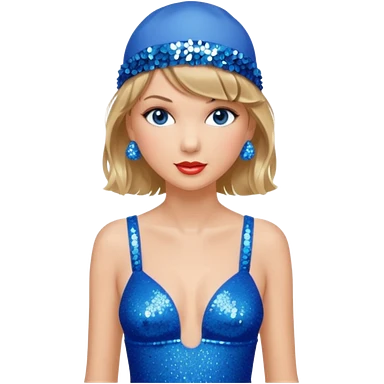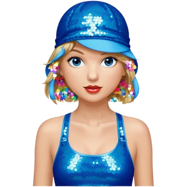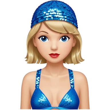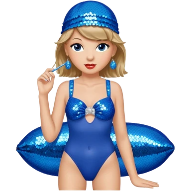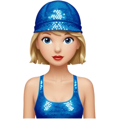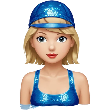 Taylor Swift wearing a one piece blue bathing suit with sparkly sequin straps. She is also wearing a sequin blue swim cap with a sequin strap going under her chin. emoji