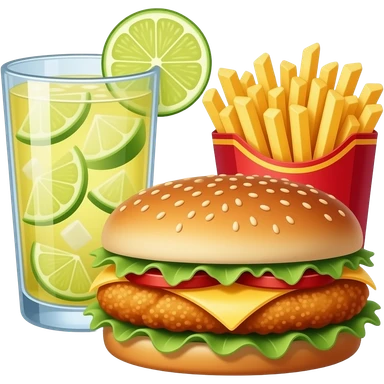 A clean and simple icon of fast food in emoji-style illustration. A burger with fries and a soda cup, bright and bold colors, simple shapes, flat design, high contrast, inviting and appetizing. emoji