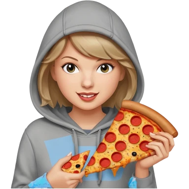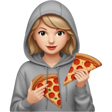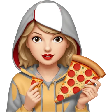 Taylor Swift, wearing hoodie, holding a slice of pizza emoji