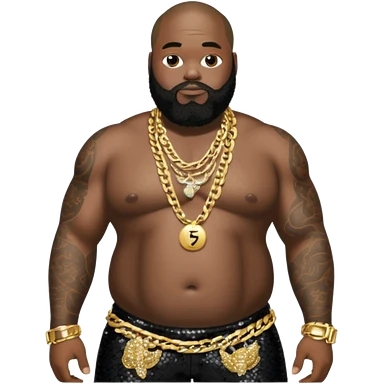 Rick Ross with black sequin baggy pants, shirtless with necklace emoji