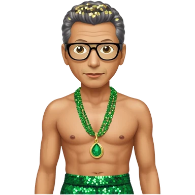 Jeff Goldblum with green sequin baggy pants, shirtless with necklace emoji