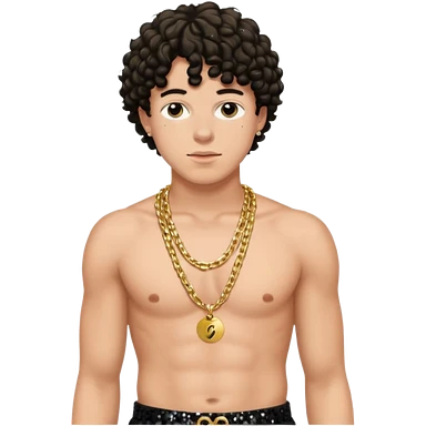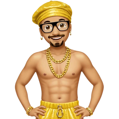 Ali G with yellow sequin baggy pants, shirtless with necklace emoji