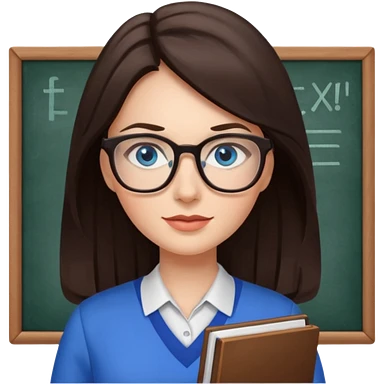 female teacher, blue eyes, brown hair, in front of a blackboard, wearing glasses emoji