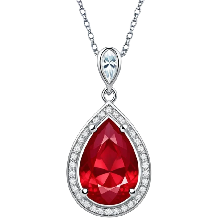 teardrop ruby pendant with a silver chain and shimmering white stones, glowing fiery red emoji | AI Emoji Generator