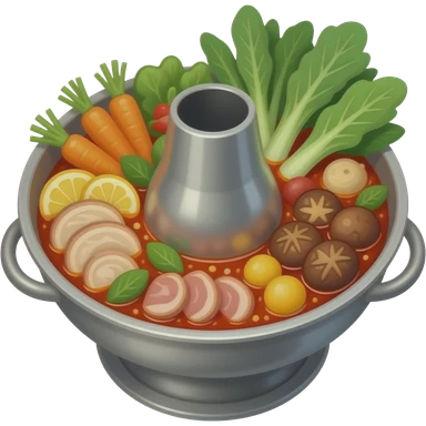 Spicy Hot Pot Skewers Malatang with various ingredients in red broth, simplified emoji style with bold outlines and bright colors, cartoon style Chinese street food bowl emoji