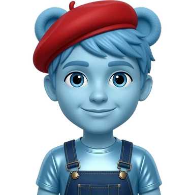 Rooney Doodle from The Doodlebops with light blue skin, blue eyes, blue teddy bear cut hair, red beret, light blue metallic shirt, dark blue metallic overalls emoji