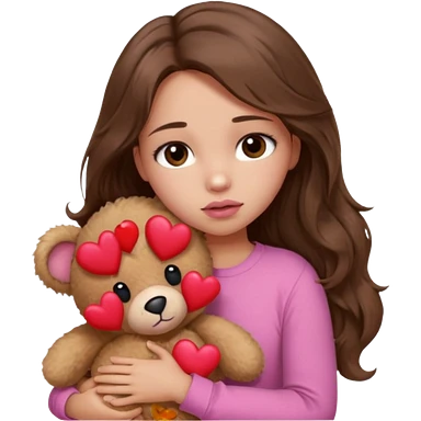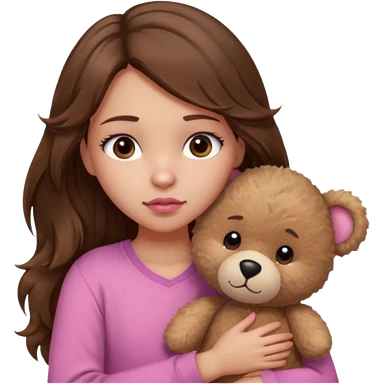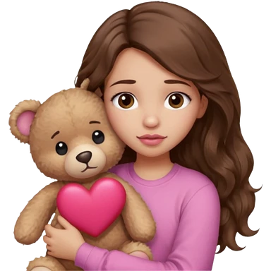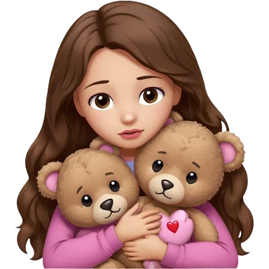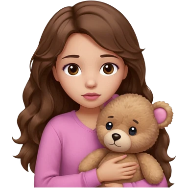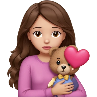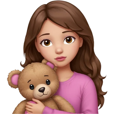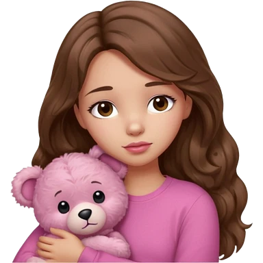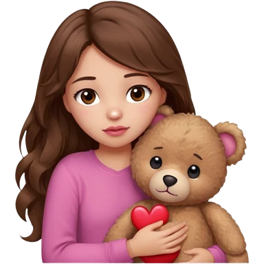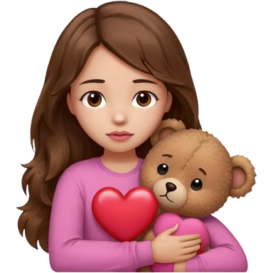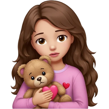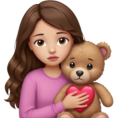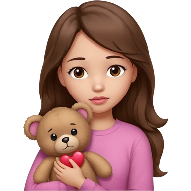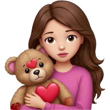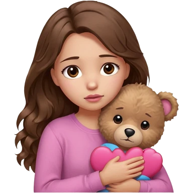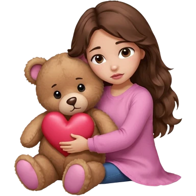 girl with long wavy brown hair, brown eyes, light to medium complexion, in a pink shirt, pink lips, long lashes, sad, hugging a teddy bear with a heart emoji