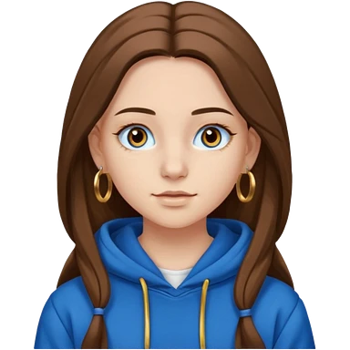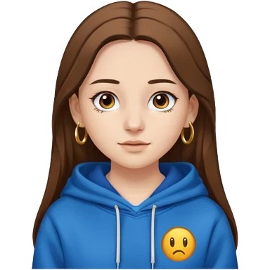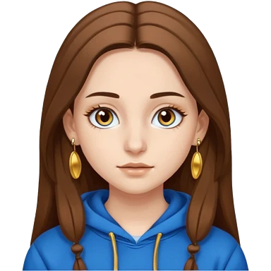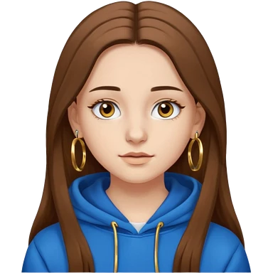 teen girl, white skin, long brown hair middle parted, brown eyes, blue hoodie eyelashes and gold earrings emoji
