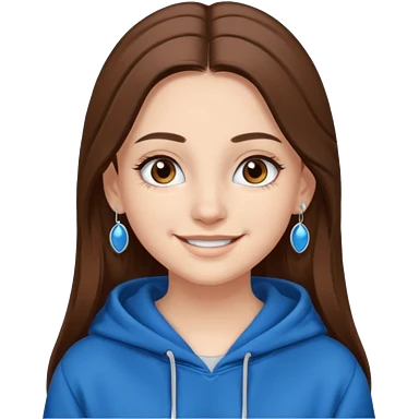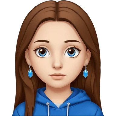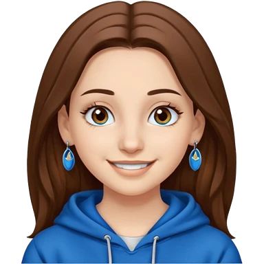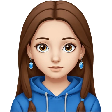 teen girl, white skin, long brown hair middle parted, brown eyes, blue hoodie eyelashes and earrings emoji