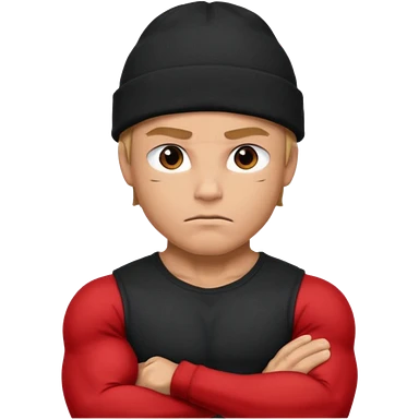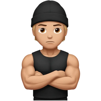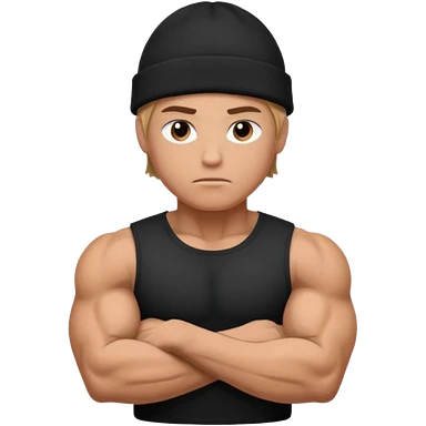 Muscular hero in black beanie, serious expression, folded arms. emoji