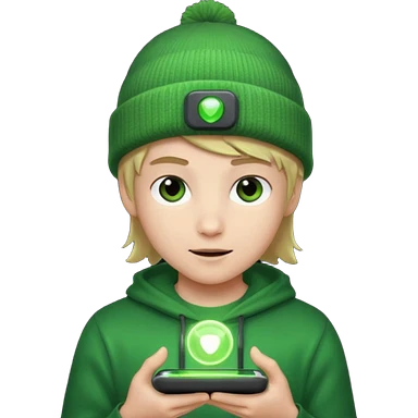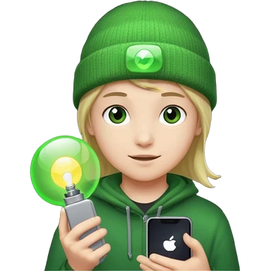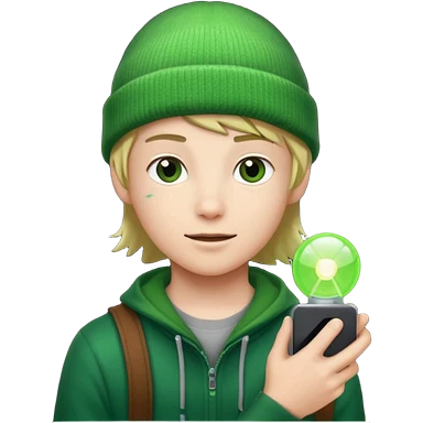Teen hero in green beanie, holding glowing gadget. emoji | AI Emoji Generator