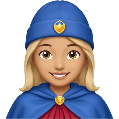 Female hero in blue beanie, cape flowing, smiling proudly. emoji