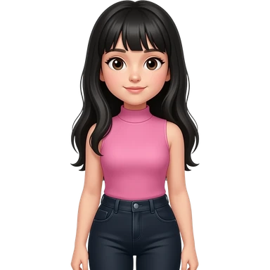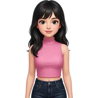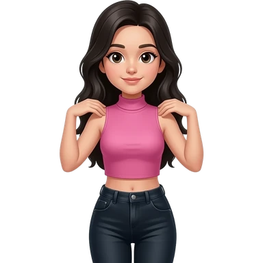 Teenage girl with long black hair wearing a pink sleeveless turtleneck top and long black jeans showing off her shoulders emoji